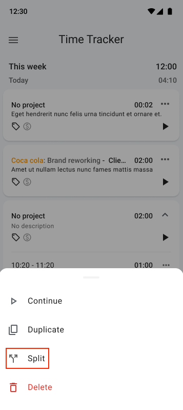 On the Time tracker screen, List tab, when you tap the three little dots in the time entry card you’ll find more options: