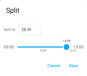 Since you are tracking time via the mobile app, they can split a time or break entry into smaller segments on the Time tracker or Calendar pages. This way, their time tracking is more accurate and flexible.