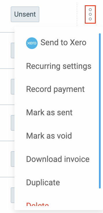 - To send an individual invoice, click on the three-dots menu next to the invoice