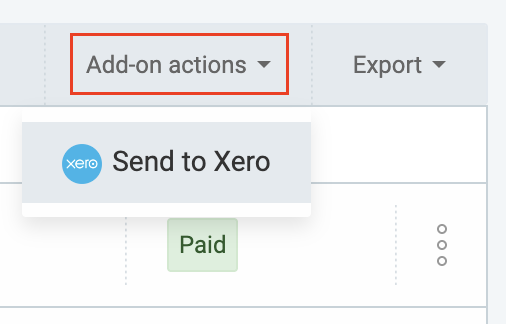 To send the invoices in bulk, choose the Send to Xero option from the Add-on actions dropdown at the top right corner.