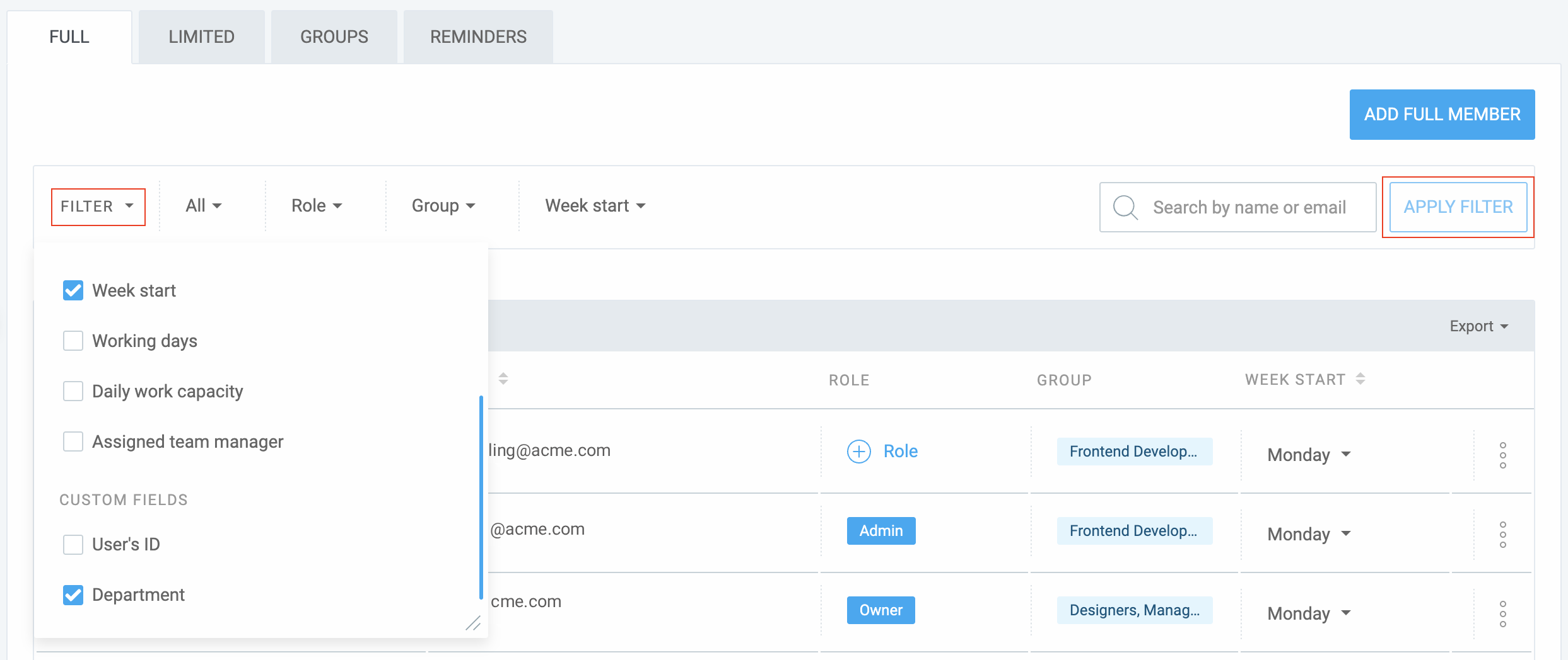 Regular users, Team managers, or Project managers can filter users in both the Full and Limited tabs based on the information you have permission to view in the table.