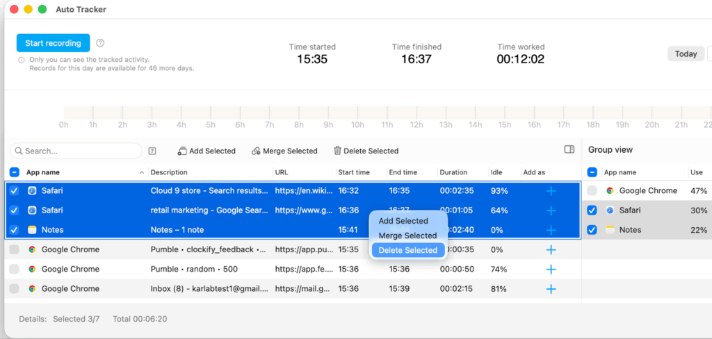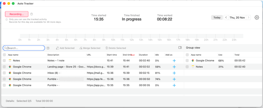 Die aufgezeichneten Aktivitäten erscheinen nur im Auto-Tracker-Fenster und werden nicht automatisch zu deiner Arbeitszeittabelle hinzugefügt. Du musst sie manuell in Zeiteinträge umwandeln.