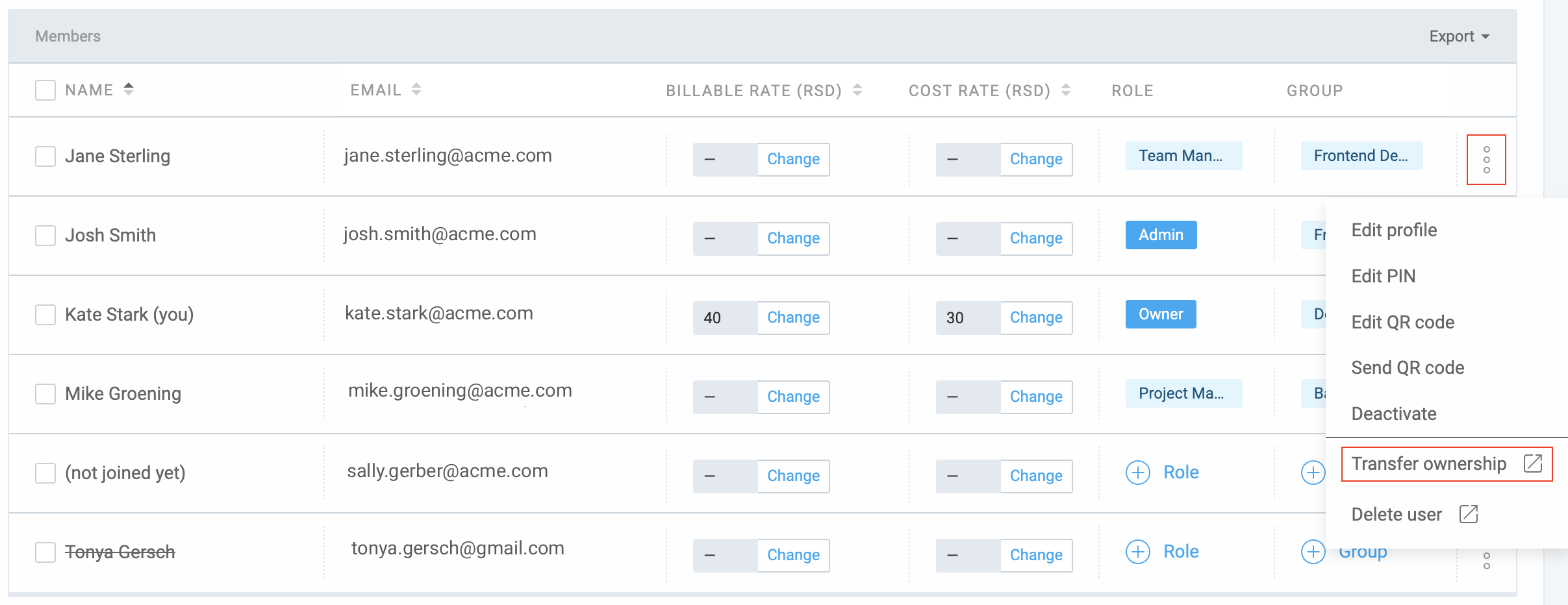 Only owners and admins can invite new users to a workspace, deactivate/delete users, revoke their invite and manage their details (set their billable rate, set as inactive, and assign to groups).