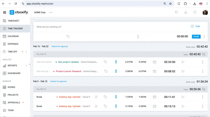 Puedes transferir tus proyectos, clientes, tareas y entradas de tiempo desde otras aplicaciones de seguimiento del tiempo como Harvest, Toggl o ClickUp a tu espacio de trabajo Clockify.