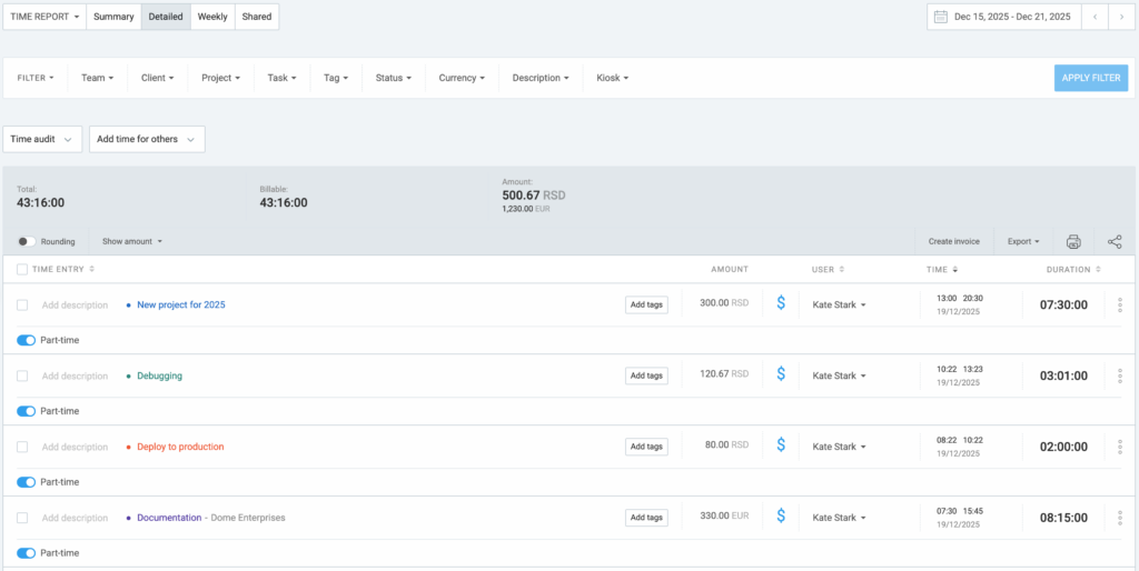 Like in any other time report, you can use filters, change timeframe, save and share the report, create invoice from report and print and export the results.