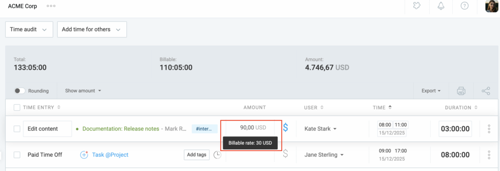 Clockify can help you organize and view billable and non-billable work by setting up different rates in Workspace settings.