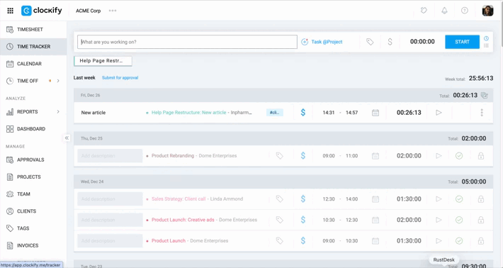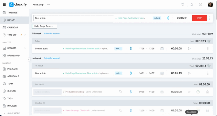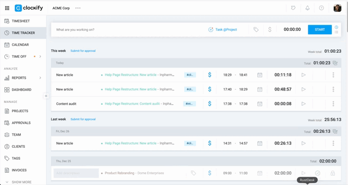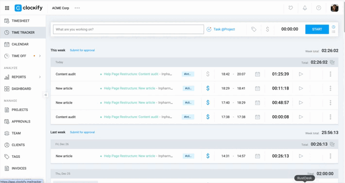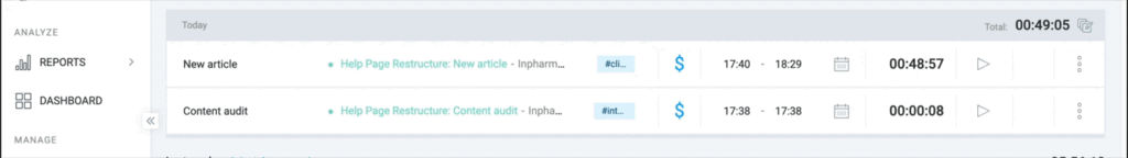 3. Resume Work: Use the Play icon on existing entries to restart the timer for recurring tasks throughout the day.