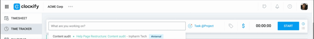 1. Start the Timer: Enter your activity description and select the project you’re working on.