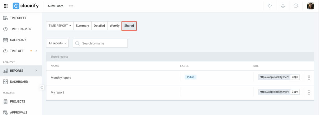 Sharing a report in Clockify lets you grant others access to real-time data without them having to navigate the full dashboard.