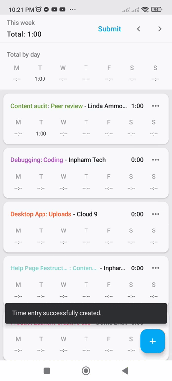- Appuyez sur une saisie de temps dans la liste pour modifier une saisie existante ou sur le bouton + pour créer une nouvelle saisie de temps