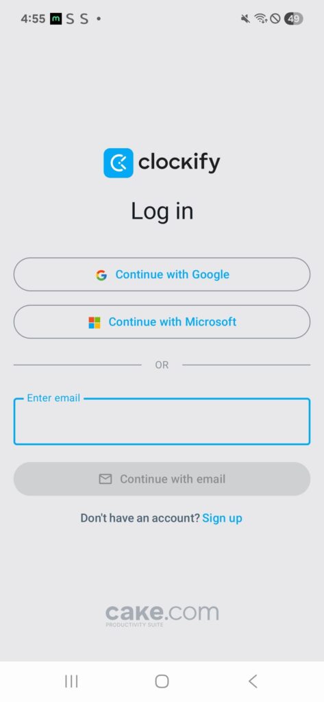 - Ouvrez l'appli et entrez l'email de votre compte Clockify