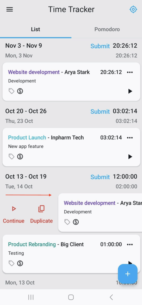 On the Time tracker screen, in the List tab, when you tap the three little dots in the time entry card you’ll find more options: