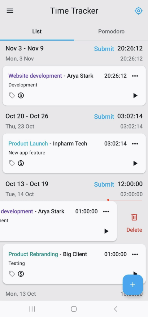 - Appuyez sur une entrée de temps dans la liste pour modifier une entrée existante ou sur le bouton + pour créer une nouvelle entrée de temps