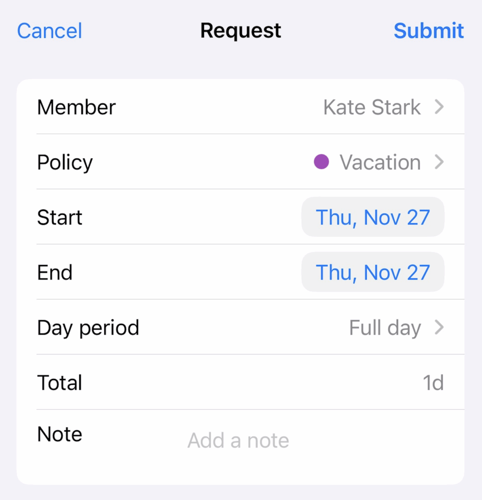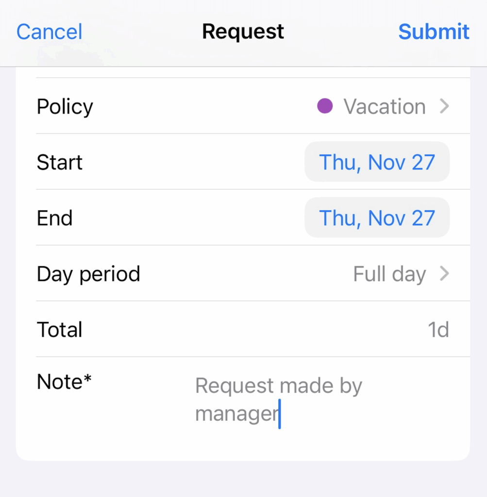 - Time off alerts: An indicator appears at the top left corner of the screen when there is a pending time off request that requires users attention. This way, managers and admins can stay on top of the approvals.