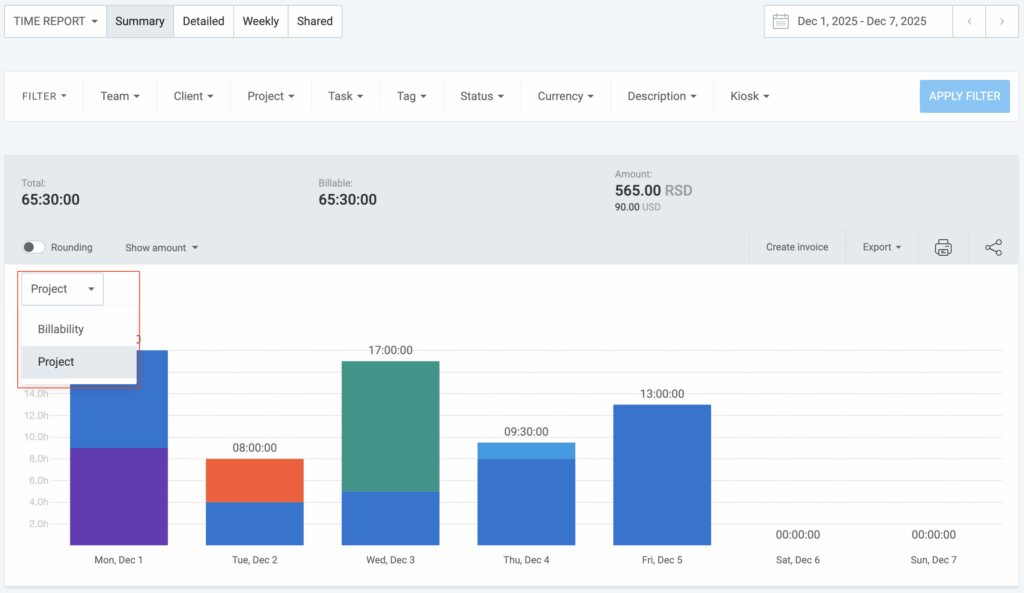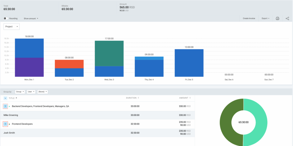 Like in any other time report, you can use filter data, change time range, share report, create invoice from time reports and print/export the results.