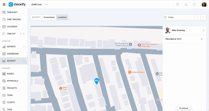 - A sidebar shows active users and their last recorded location for the day. A red recording dot indicates a timer is currently running.