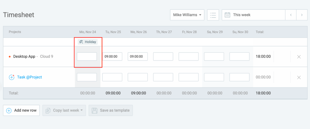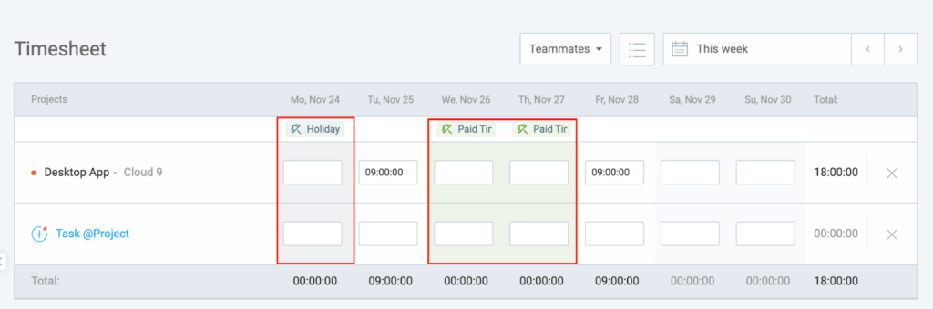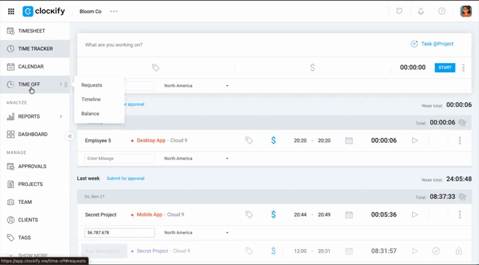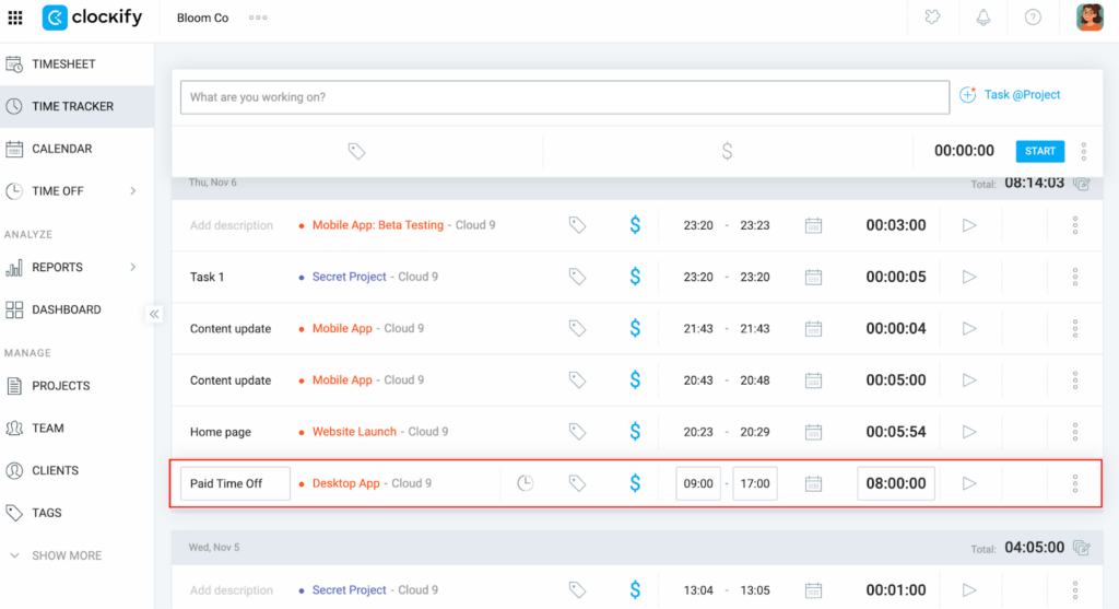 Clockify lets you track holidays and time off so your team’s non-working days are accurately recorded.