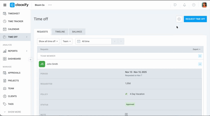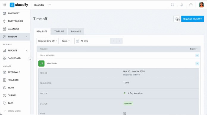 When a time-off request is approved, Clockify creates an entry for every date in the request range. Only workspace owners and admins can delete these entries.