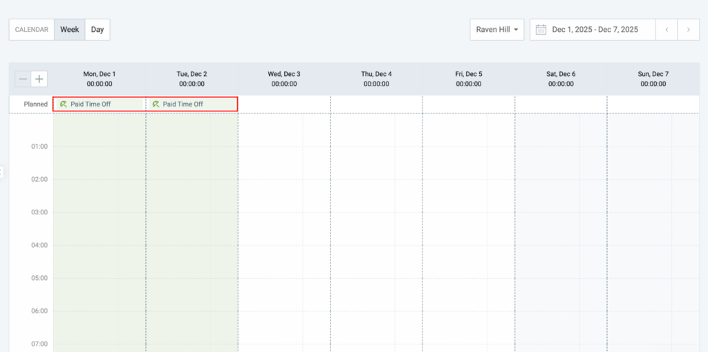 - Time off and holiday entries are marked by a Paid Time Off icon within the tracking columns.