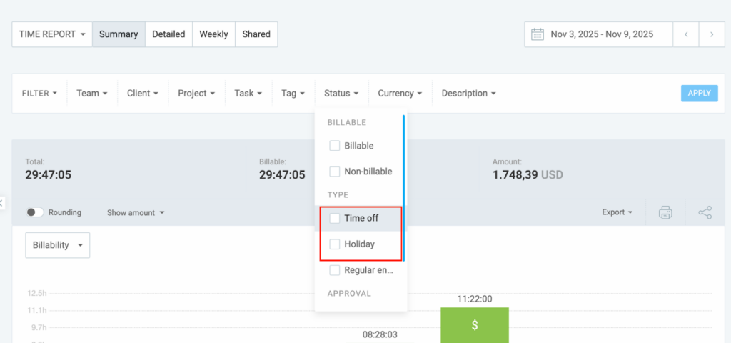 In the Summary and Weekly reports, you can use the Time Off and Holiday filter in the Status section to view users with time off entries.