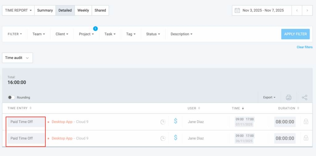 In the Detailed report, time-off entries have a Paid Time Off label.