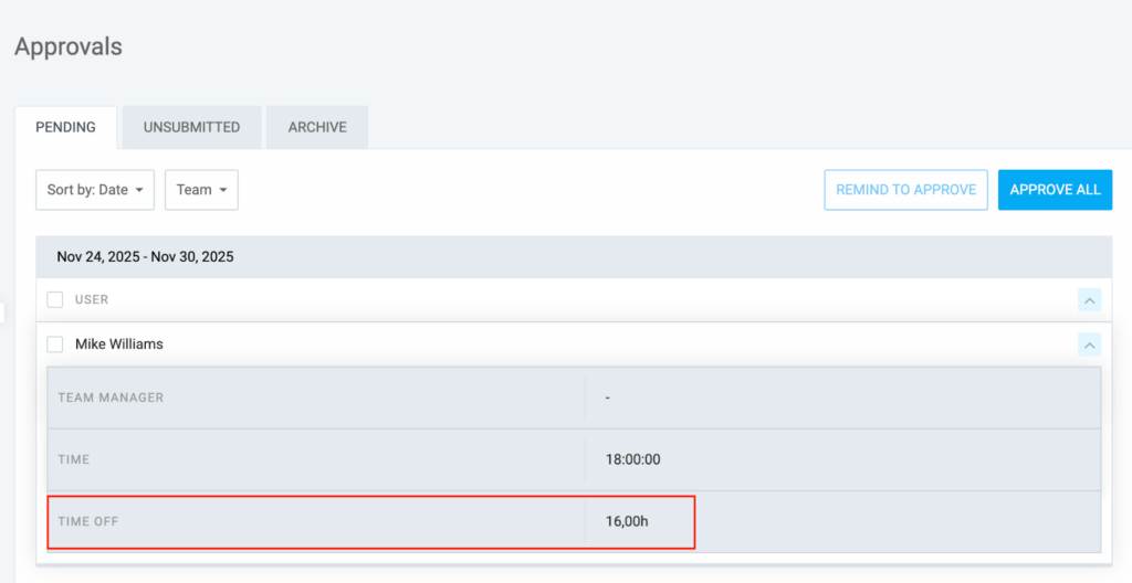 - Time-off entries in the Time Tracker page show a gray time-off icon