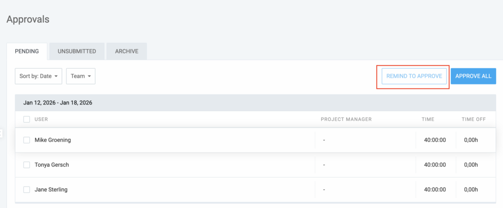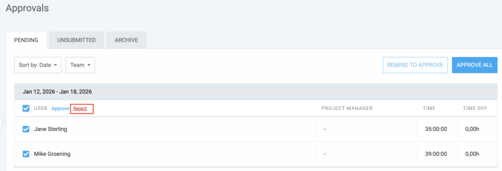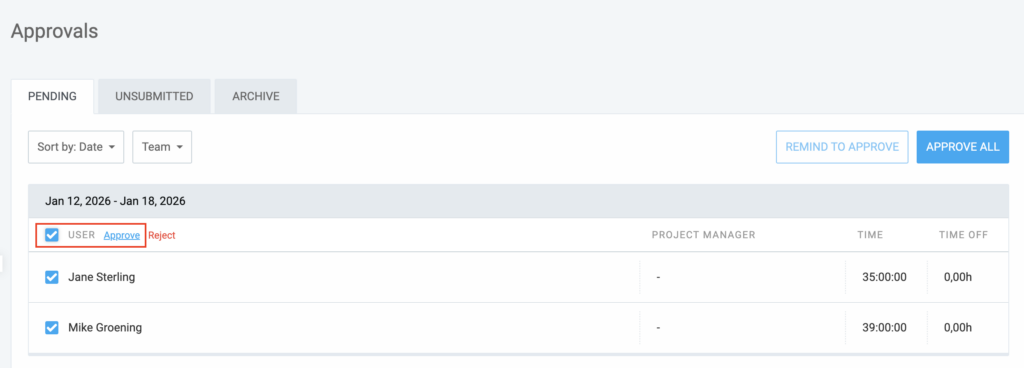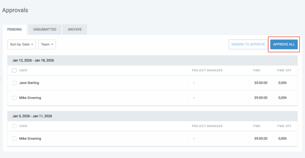 - Admins and Team Managers: Team members can approve time entries for users they manage