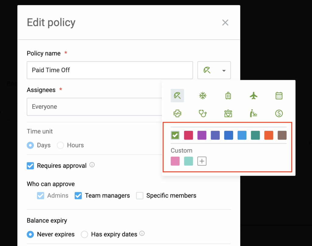 - Policy colors: You can change these colors in the Time off policy settings.