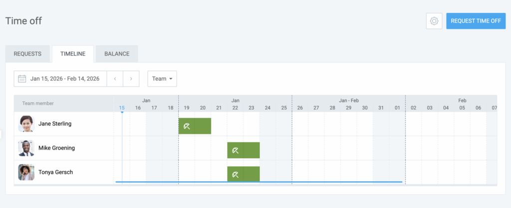 To get a quick overview of upcoming time off for your team, use the Timeline view: