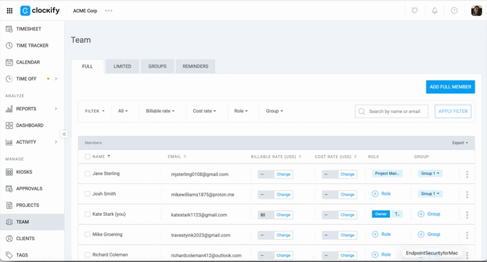 - Limited – For members who only need to clock in and out via Kiosk