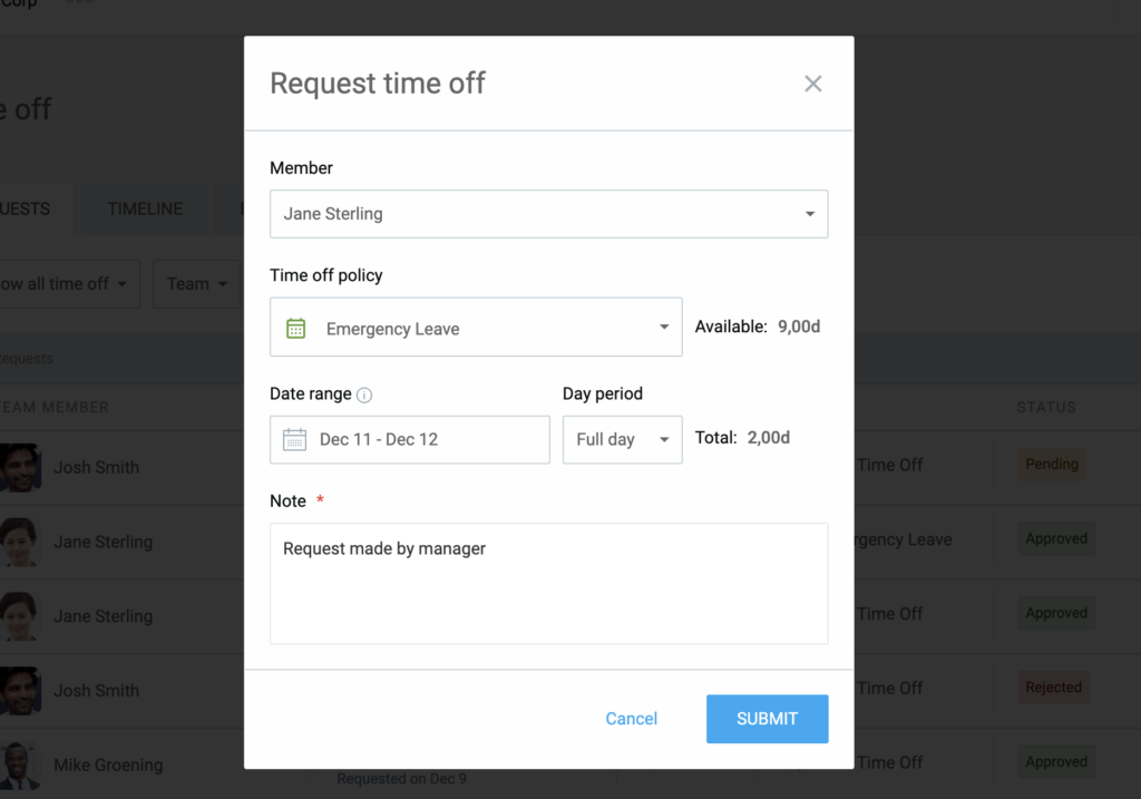 - Request on behalf: Team Manager and Project Managers can submit time off requests for users they manage. This request will include a note: “Request made by manager.”