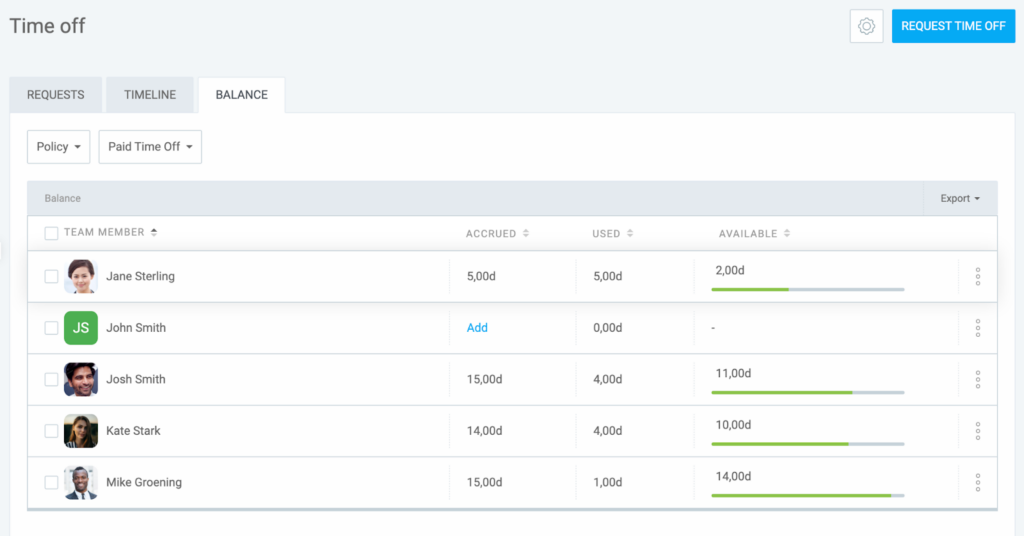 - Track balances: View team members’ current time off balances and review the complete history of their past requests.