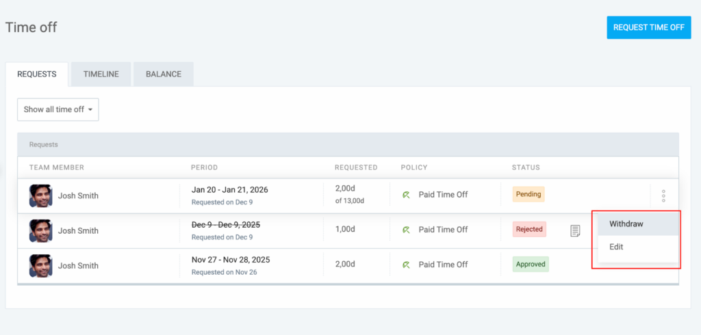 - Withdraw or edit pending requests: Managers can withdraw or edit their own pending time off requests and those of their team members.