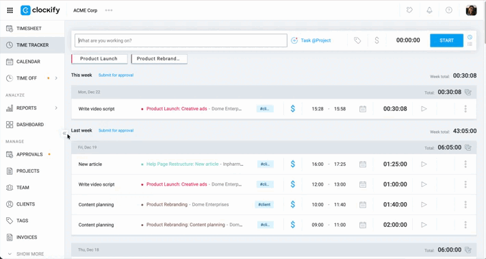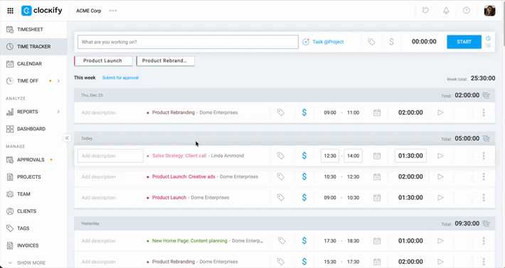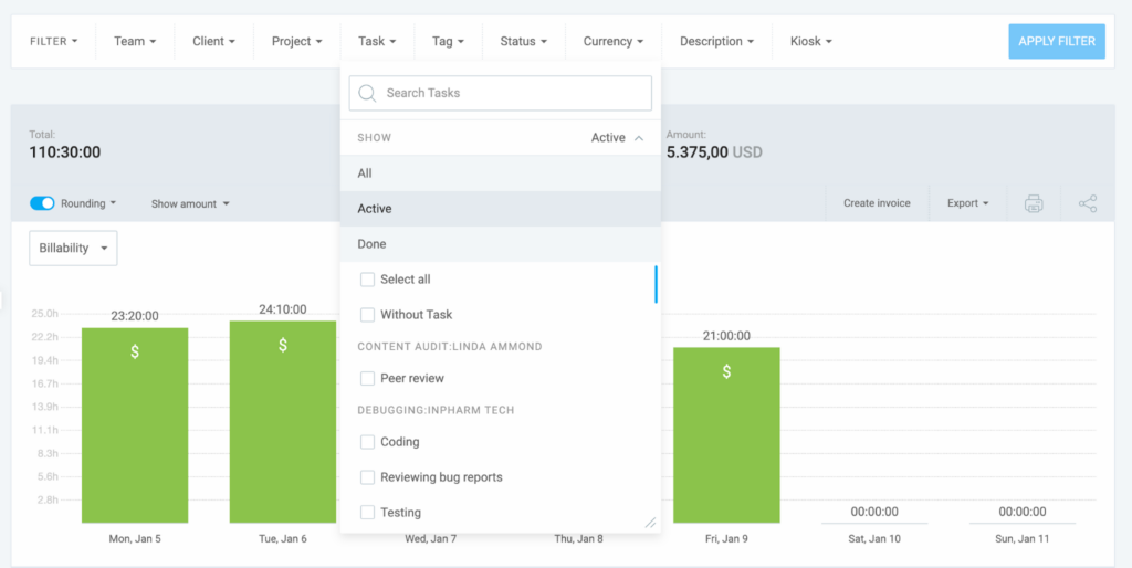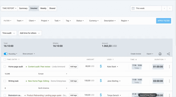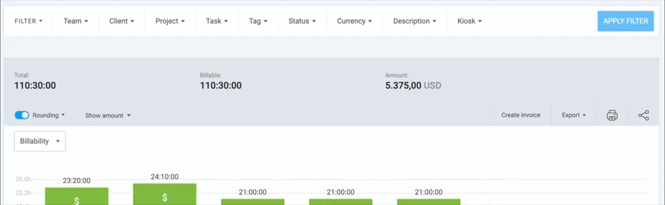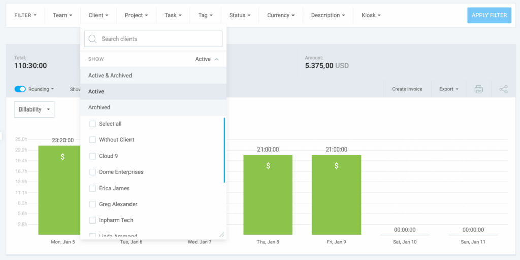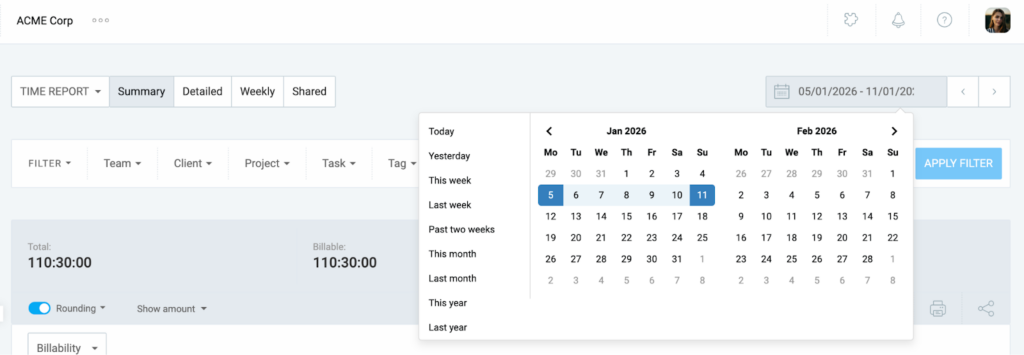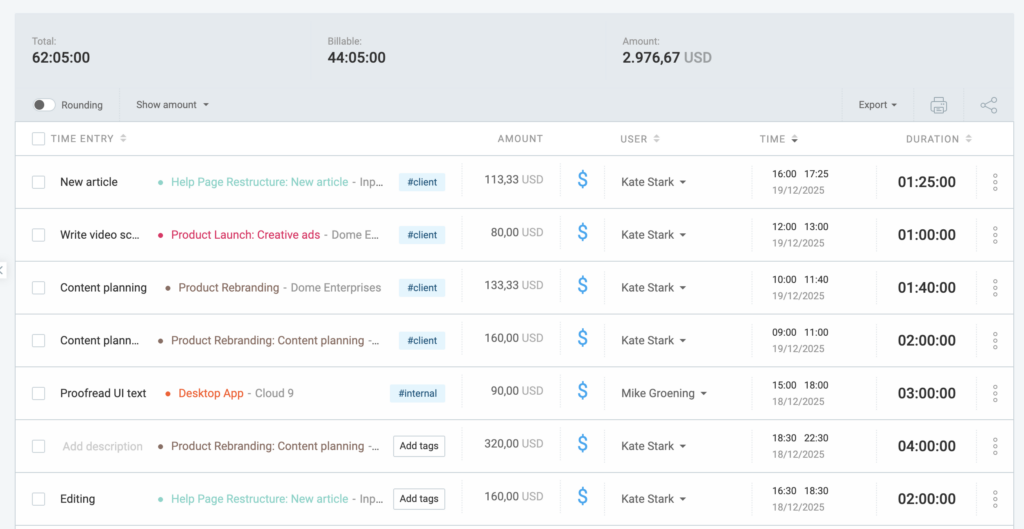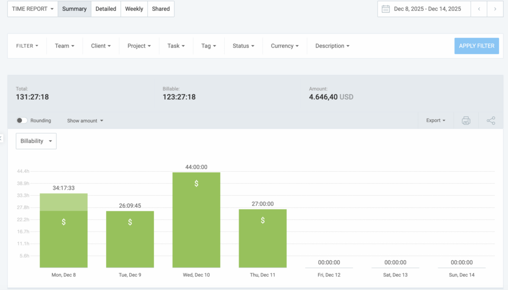 Clockify allows you to filter your reports by several criteria to get the data you need. For more precise reporting, you can enable or disable rounding for the time entries.