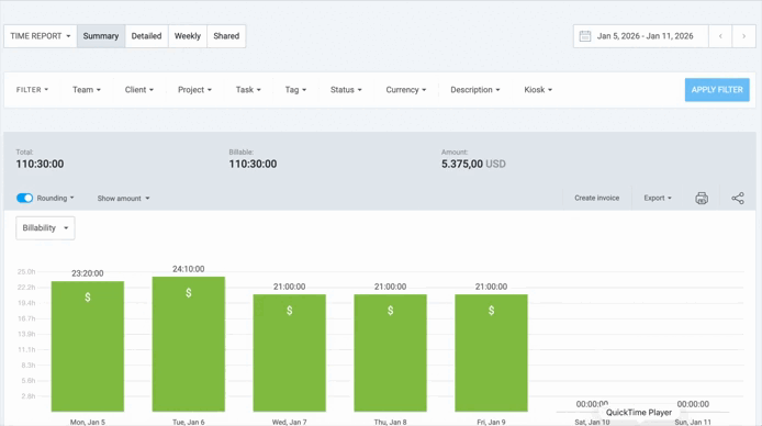 Weekly report is great for weekly tracking because it shows time entries grouped by user or project within a fixed week range.