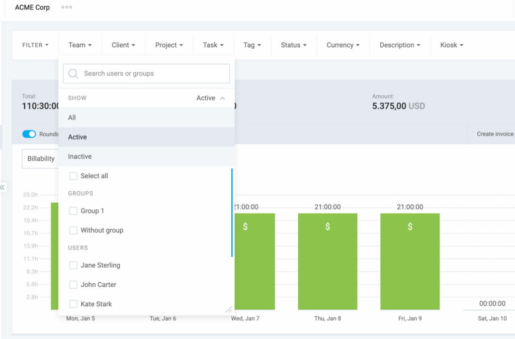 Admins can select individual users or entire user groups. Regular users typically only see their own time, depending on the Workspace permissions.