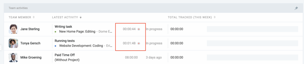 | Tabela de atividades da equipe | Uma tabela que exibe a atividade mais recente de cada membro da equipe. Isso mostra quem está ativo no momento (cronômetro em execução) ou sua última entrada registrada. |