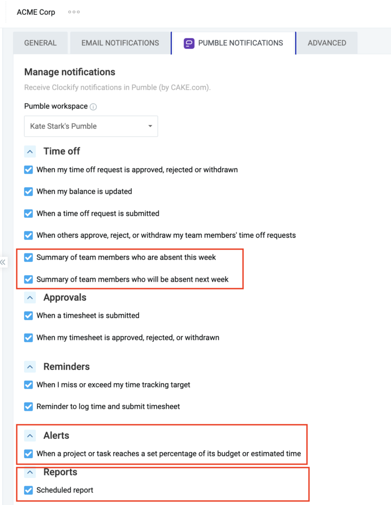 - Você receberá notificações do Clockify no Pumble com base em suas preferências.