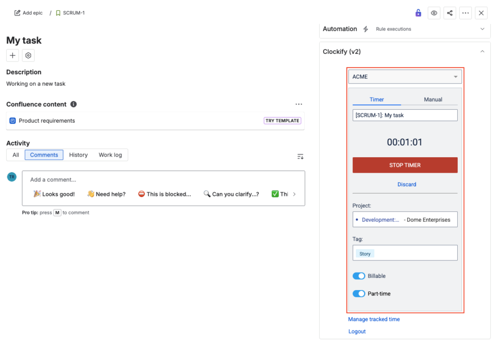 Ao iniciar o cronômetro, o Clockify coleta automaticamente as seguintes informações do Jira e as sincroniza com seu registro de tempo: