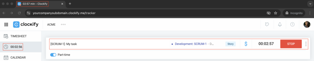 O cronômetro é sincronizado com sua conta Clockify em todos os dispositivos e pode ser interrompido no Jira ou em qualquer um dos aplicativos Clockify (navegador, celular ou computador).