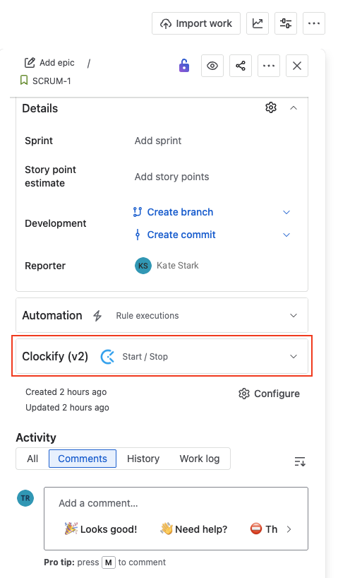 Após a instalação do aplicativo, o botão do cronômetro Clockify aparecerá em todas as tarefas do Jira.