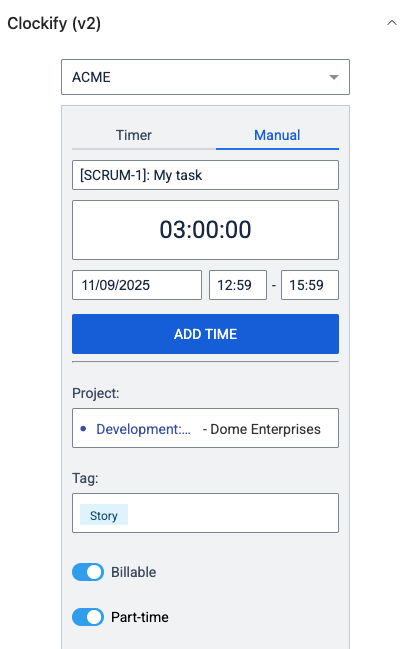 • As informações sobre uma Epic ou Sprint não serão registradas. No entanto, o registro de tempo diretamente em uma Epic criará uma entrada de tempo com a tag Epic.