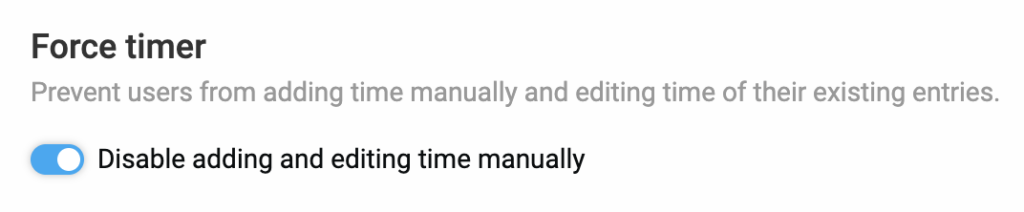 Proprietários/administradores podem desativar o modo manual e ativar a opção Forçar cronômetro nas configurações do espaço de trabalho Clockify.