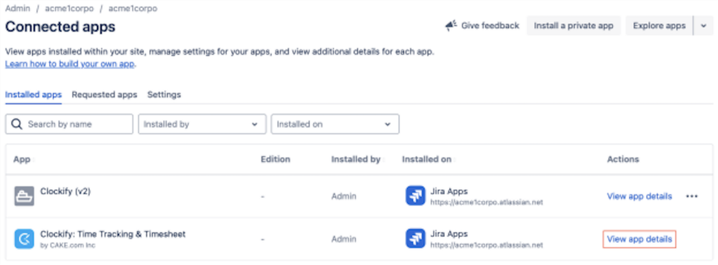 Somente administradores do Jira podem gerenciar aplicativos no Jira e instalar o aplicativo Clockify.