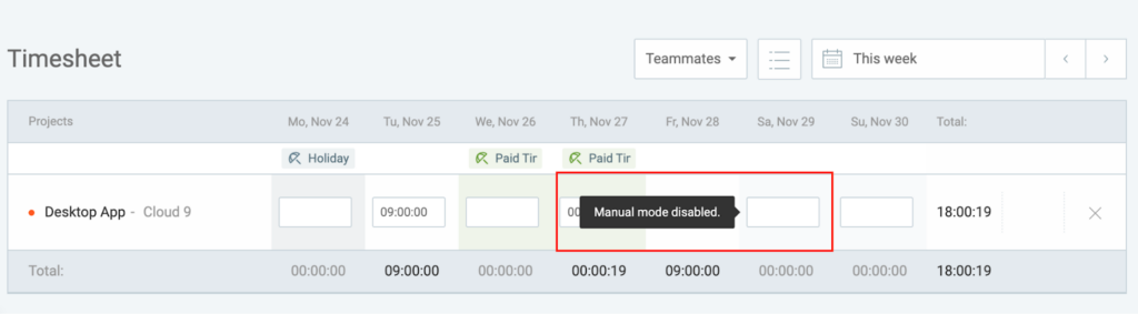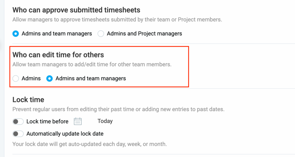 Os gerentes de equipe, juntamente com os administradores, podem adicionar ou editar registros de tempo para os membros de suas equipes, se isso estiver habilitado nas Configurações do Espaço de Trabalho.