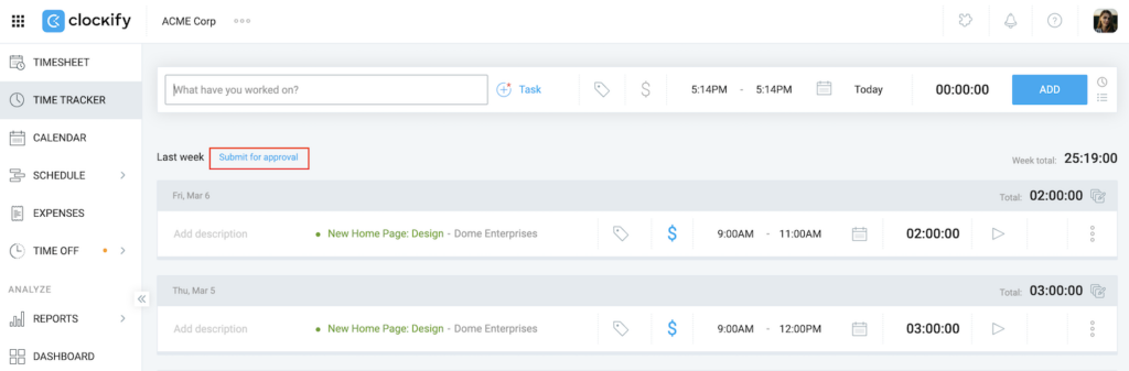 Se você é administrador ou gerente de equipe, também pode enviar o tempo na página Aprovações.