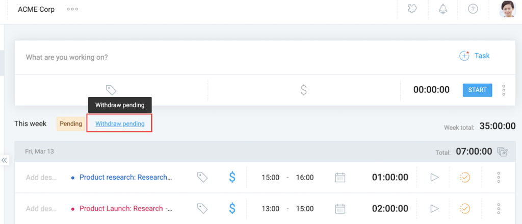 Se você passar o mouse sobre a etiqueta Aprovação pendente, verá o nome do usuário que enviou as despesas. Ao clicar em Retirada pendente, você poderá retirar a aprovação. Se você fizer isso, um administrador ou gerente não poderá aprovar tempo e despesas, a menos que você envie novamente.