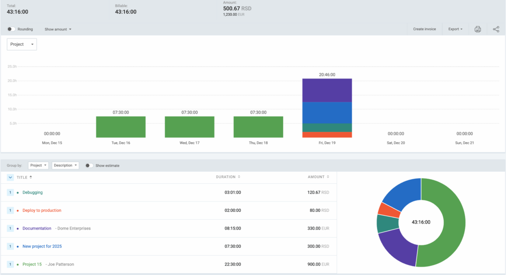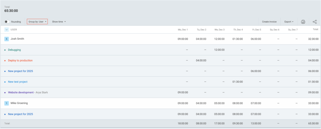 If you’d like to view your employees’ hours, the most common scenario to get this info would be to group the data by User and subgroup it by Project. You can further subgroup it by Task. This way you’ll get a breakdown of your employees’ hours by specific tasks while working on certain project.