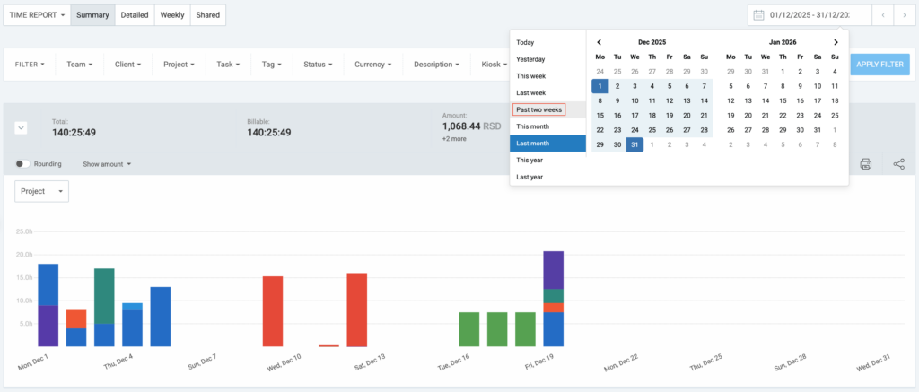 This is great if you need to get a bi-weekly or monthly report of your team’s hours so the Weekly report doesn’t cut it.