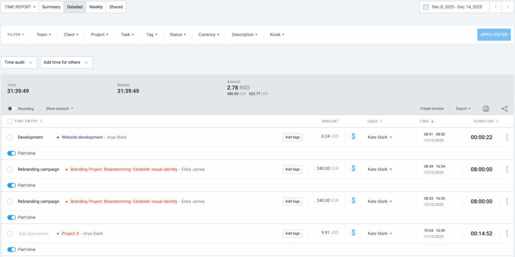 The Detailed report will let you see all the details of your team’s time entries one by one, not grouped or summarized. It’s also possible for an Admin to edit the team’s time entries in this report.